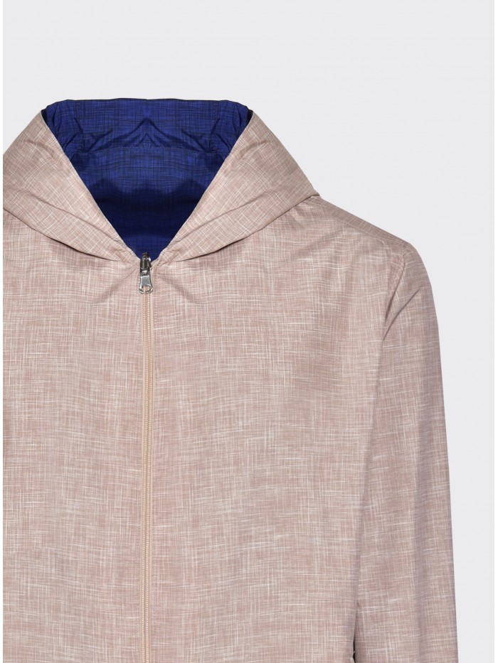 Realizzato in tessuto tecnico effetto lino, questa giacca unisce l’estetica naturale e materica del lino alla performance del poliestere: resistenza, leggerezza e protezione. La costruzione double face reversibile offre due anime in un unico capo: un lato in blu fresco e luminoso, l’altro in beige naturale, per adattarsi facilmente a diversi outfit e momenti della giornata.